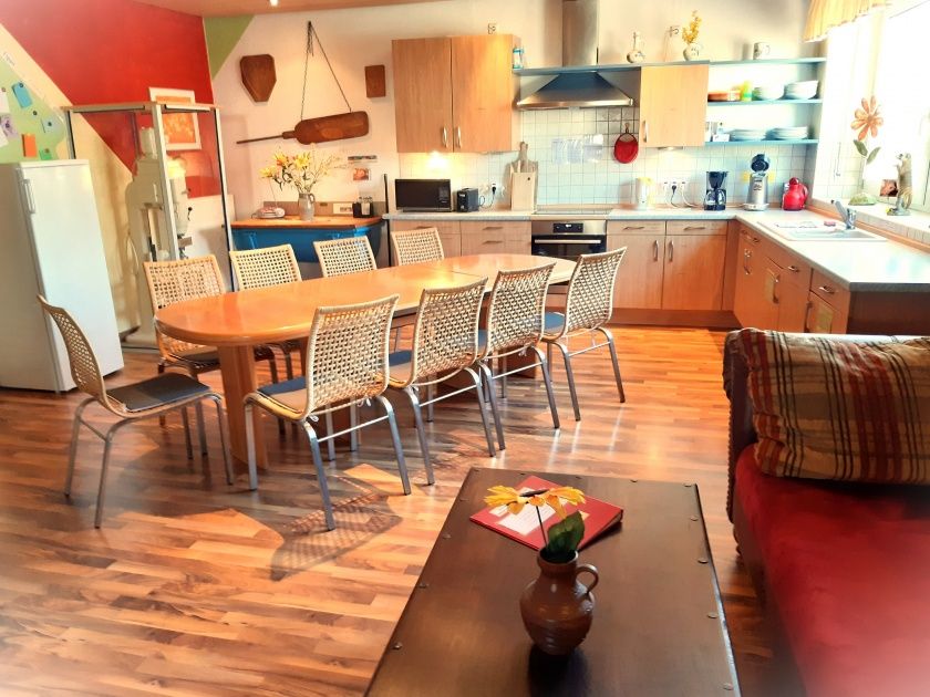 - ca. 40 qm große Küche (mit Kühl/Gefrierschrank, Herd mit Cerankochfeld und Backofen, Spülmaschine, Kaffeemaschine, Wasserkocher, Mikrowellenherd, 2 Kinderhochstühlen)