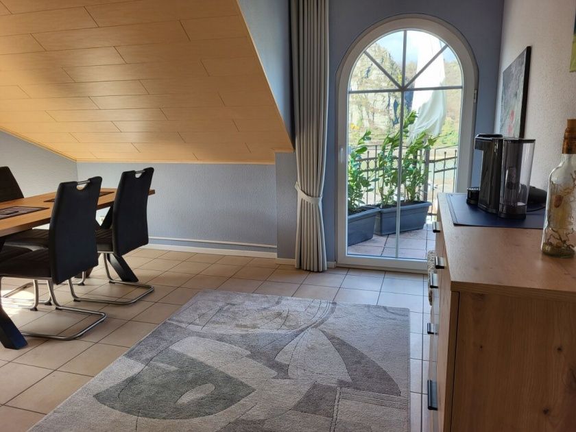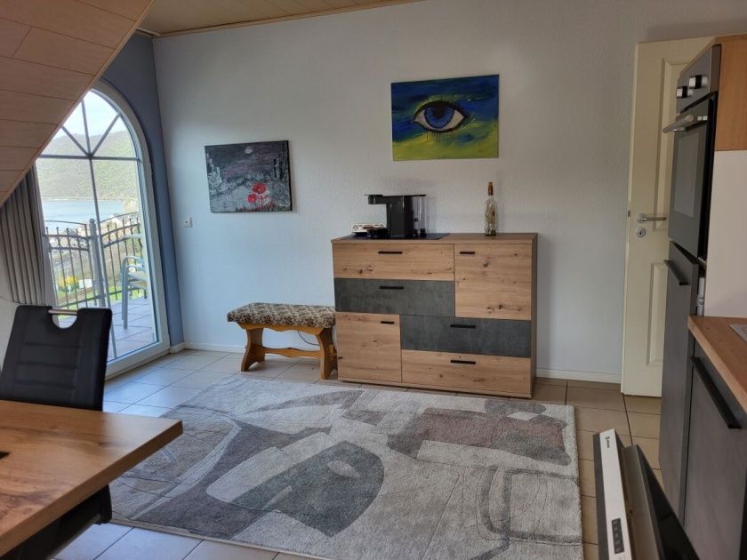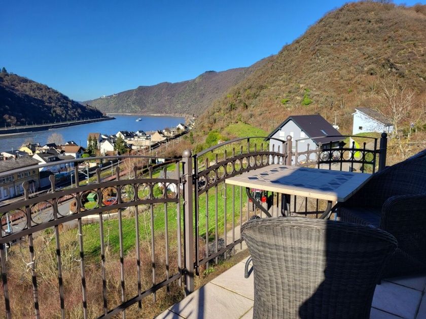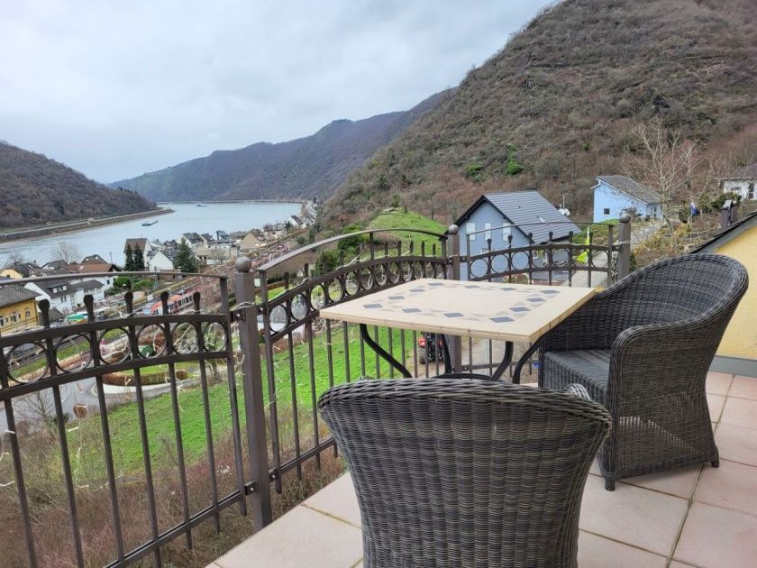 Die Ferienwohnung Rheinblick 2 befindet sich im Obergeschoss, ebenfalls mit separatem Zugang. Sie besteht aus einem großen Wohnzimmer mit Klimaanlage. Das ebenso separate große Schlafzimmer mit eigenem Balkon und Fernseher verfügt über ein großes Kingsize-Bett. Die große Küche mit gemütlicher Essecke ist voll eingerichtet. Von allen Zimmern hat man einen Zugang zum großen Westbalkon.
