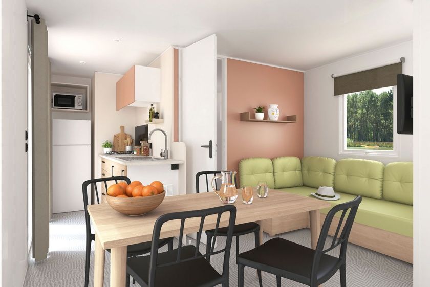 Unsere 3 Mobilheime sind komfortabel und gut ausgestattet. Sie verfügen über ein Doppelzimmer und ein Kinderzimmer mit Stockbetten.