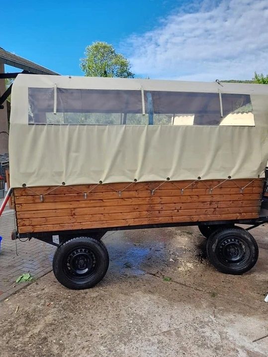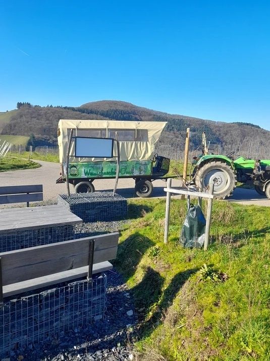 Planwagenfahrt mit Weinprobe oder Glühwein, je nach Jahreszeit.