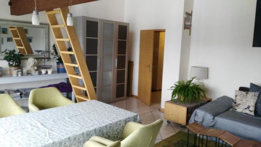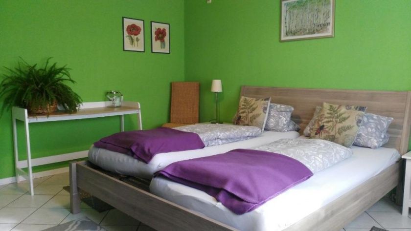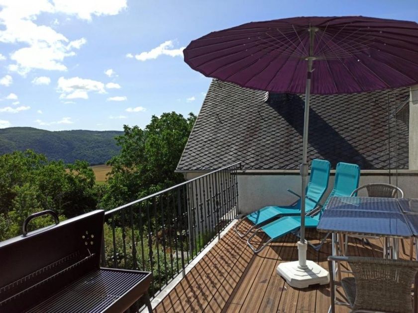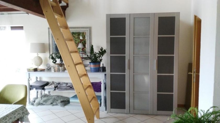 Viel Platz für Familien, Freunde, Gruppen. 2 DZ, davon eins mit zusätzlichem Einzelbett und Platz für ein Babybett, Schlafgalerie im Wohn-Essraum mit großem Doppelbett und kleinem Doppelbett, Ausziehsofa für 2 Personen im Wohnraum, großes Bad mit Dusche und Wanne, voll ausgestattete Küche, 16 qm Terrasse. Vollverglaster Giebel im Wohn- Essraum mit Traumblick über das Rheintal.