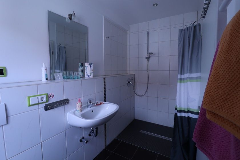 • Tageslichtbad mit bodengleicher Dusche, Toilette und unterfahrbarem Waschbecken (Handtücher inklusive)