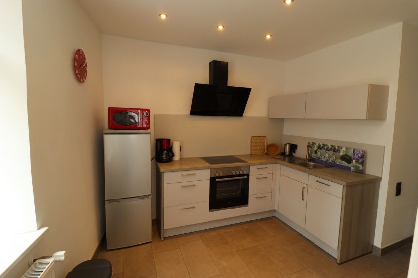 • Küchenzeile mit Herd, Backofen, Mikrowelle, Kühl-Gefrierschrank, Filterkaffeemaschine, Wasserkocher, Geschirr, Spülmaschine