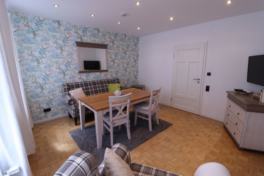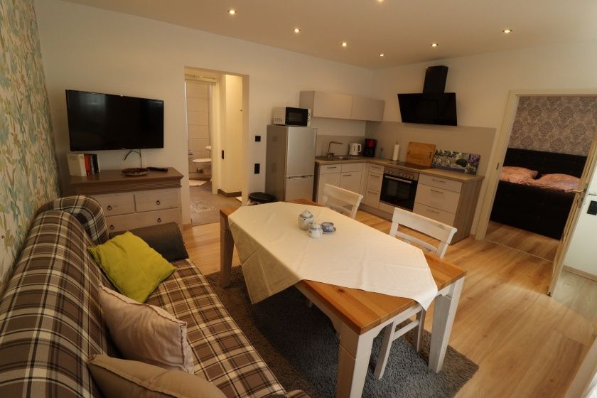 Ferienwohnung Nr. 1 ist für 2 Personen ausgelegt. Ferienwohnung Nr. 2 ist für 4 Personen geeignet. Beide Wohnungen liegen im EG. Dieses ist über drei Stufen oder einen Lift erreichbar.