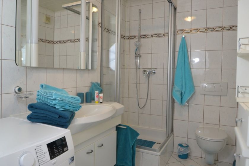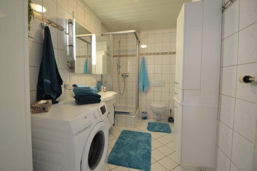 - Im Badezimmer befindet sich eine große Dusche mit Glaskabine, eine Toilette und ein Waschbecken, sowie eine Waschmaschine. Hand- und Badetücher liegen bereit und Sie finden weitere im Hochschrank, in dem sich auch der Fön befindet.