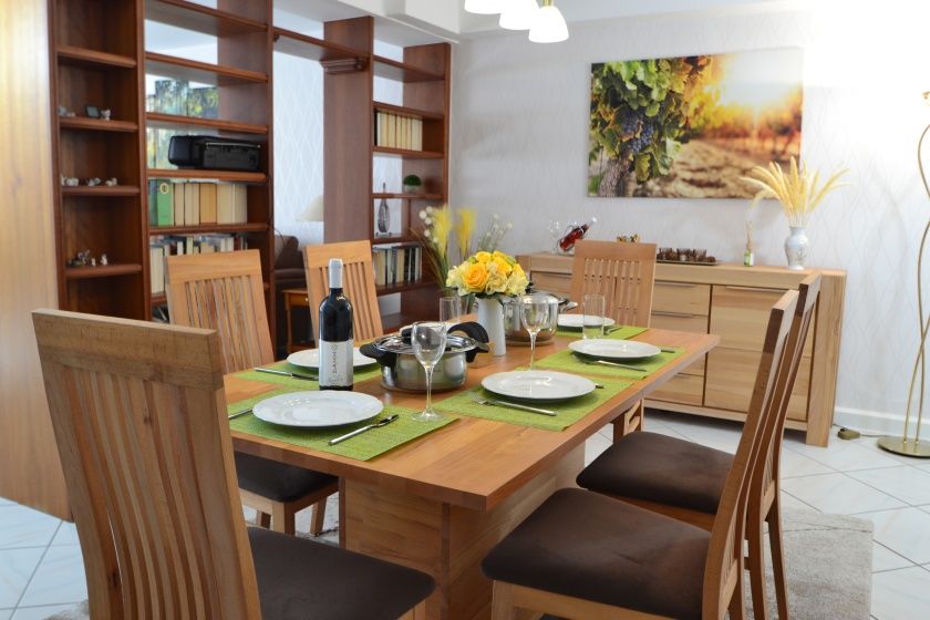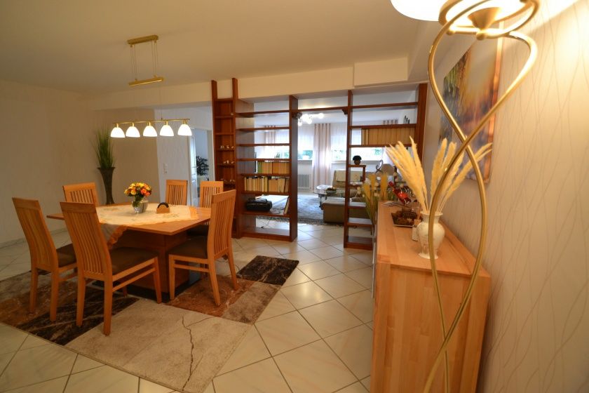 - Das Esszimmer grenzt direkt an das Wohnzimmer an und bietet einen geräumigen Esstisch, der für gemütliche Mahlzeiten oder Spieleabende genutzt werden kann.
