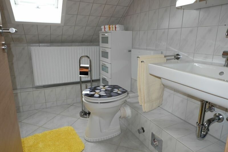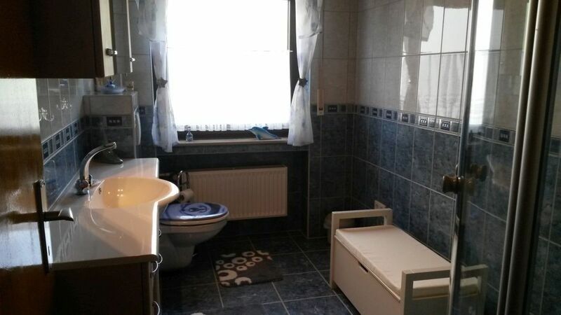 - Badezimmer: Waschbecken, Dusche, Toilette, Fenster, Spiegel, Föhn, Handtücher