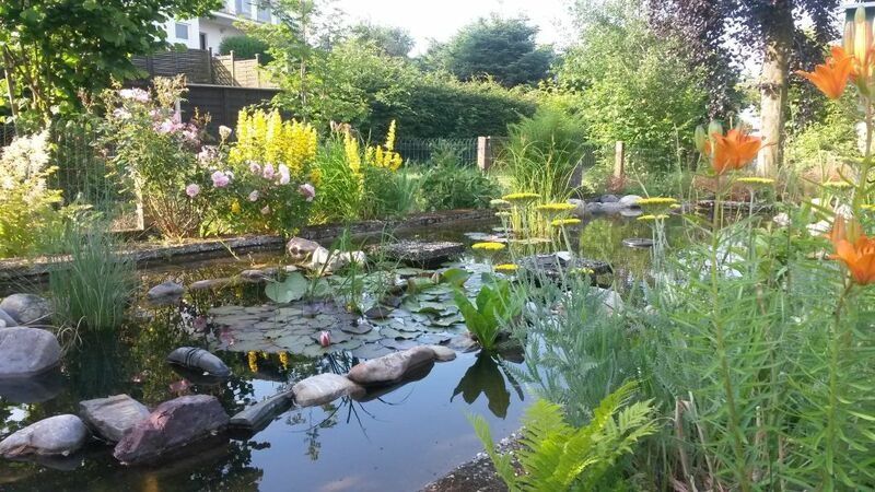 Der 1000 qm große Garten mit 2 Fischteichen steht ihnen mit Ruhebänken, Sonnenschirm, Liegewiese und Grill zur Verfügung.
