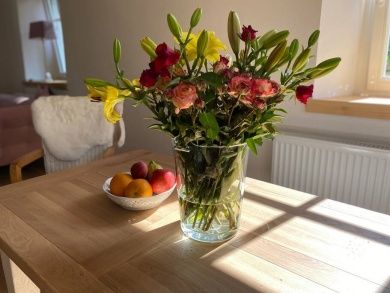 - Das Wohnzimmer mit Essbereich und offener Küche befindet sich im Erdgeschoß. Für kalte Winterabende gibt es einen Schwedenofen von Morsoe, zusätzlich zur Zentralheizung