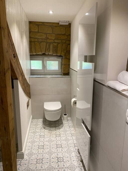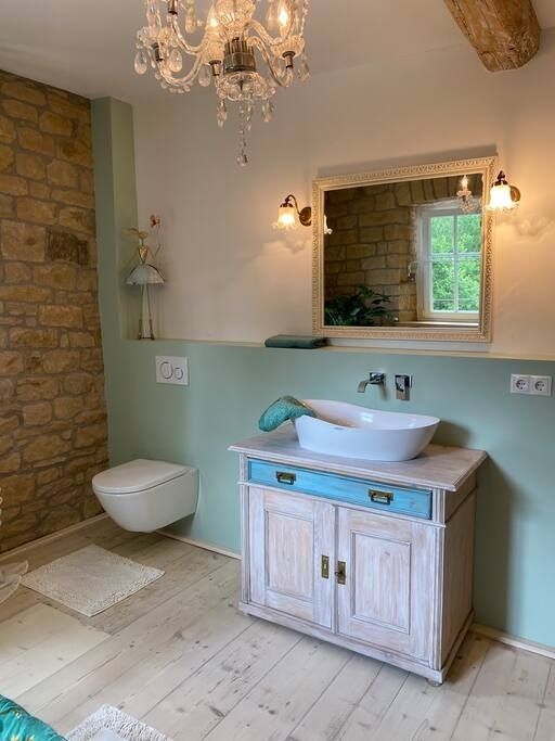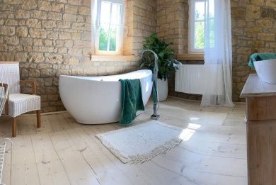 - Es gibt 2 Tageslichtbäder, im Erdgeschoß modern mit großer begehbarer Dusche, im Obergeschoß romantisch mit freistehender Badewanne.