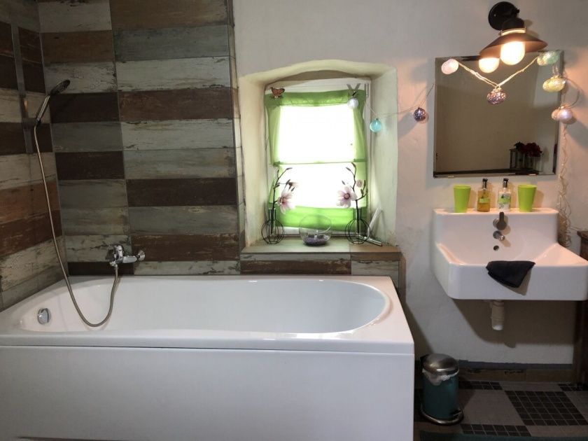 - Badezimmer mit Dusche, WC, Föhn und Badewanne