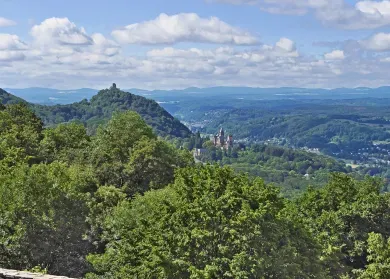 • Wenn Sie die 96 Stufen erklommen haben, werden Sie mit einem tollen Panoramablick über die waldreiche Landschaft mit direktem Blick auf das Hachenburger Schloss und auf das markante Siebengebirge belohnt.