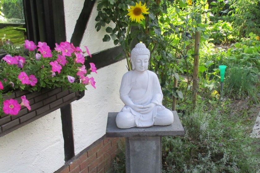 Eine Terrasse mit Gartenhaus und Liegewiese, Hängematte, Gartenmöbel und Grillmöglichkeit lädt zum Verweilen und Ausspannen ein.