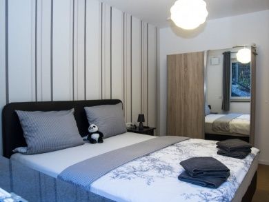 Ihr Apartment Moselsteig für 4 Personen liegt im EG, hat eine große Terrasse (50 m²) mit Grillstation, ist modern und hochwertig (u. a. Boxspringbetten, ebenerdige Regenwasserdusche etc.) eingerichtet.
