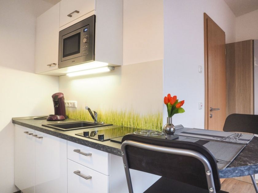 - Komplett eingerichtete Küche mit Ceran-Kochfeld, Mikrowelle, Kühlschrank, Gefrierfach, Kaffeemaschine, Toaster und Wasserkocher