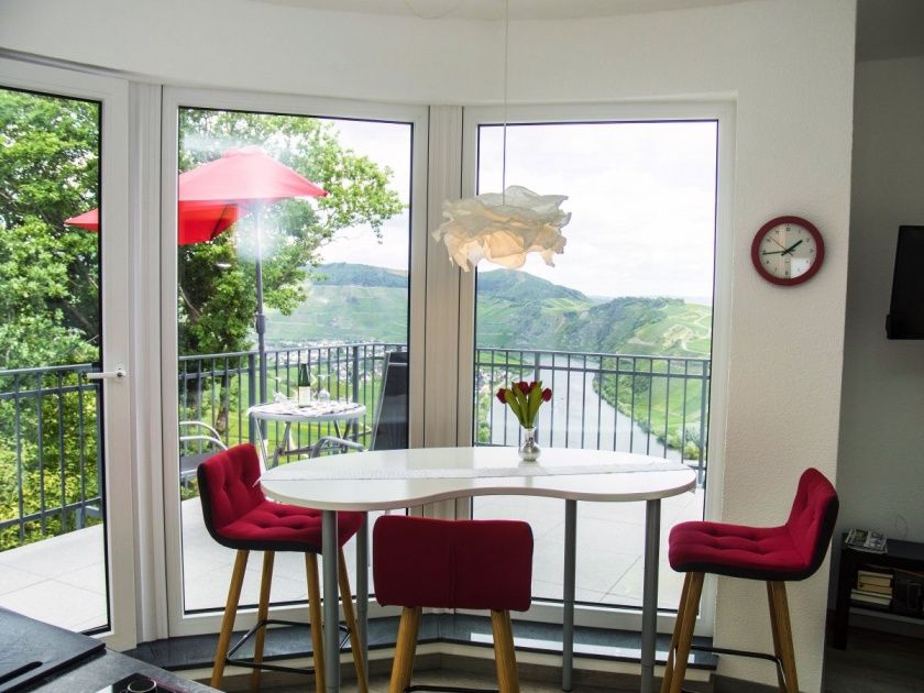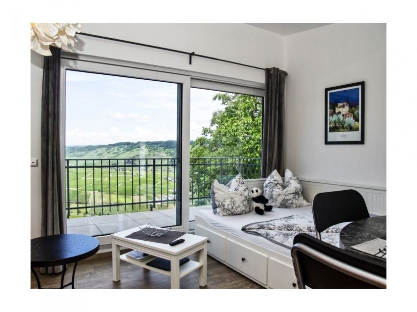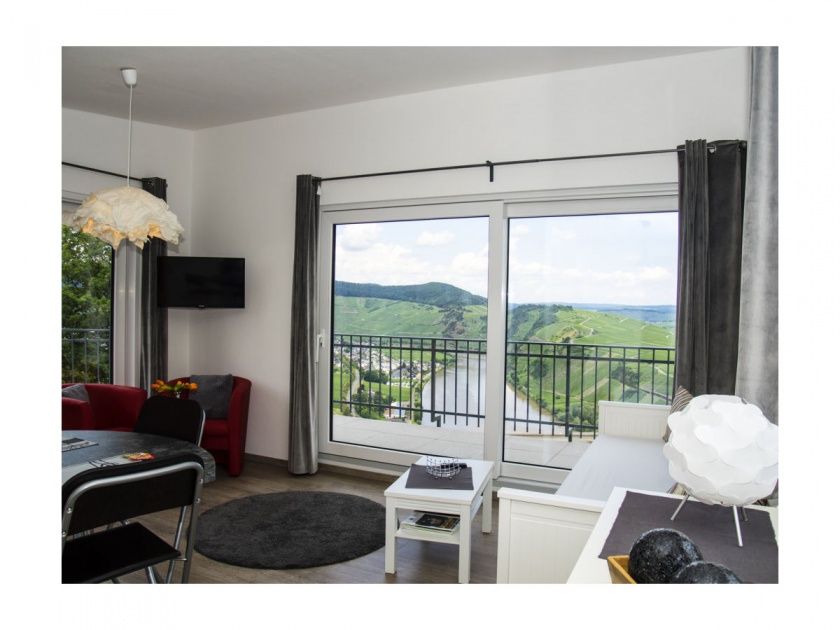 Von Ihrem Balkon und den raumhohen Fenstern Ihres Apartments erleben Sie, wie die Mosel eindrucksvoll ihre Schleife zieht von Piesport, flußabwärts vorbei an den Steilhängen der Moselloreley, vorbei an den Moseldörfern Minheim und Wintrich bis am Horizont nach Filzen/Brauneberg.
