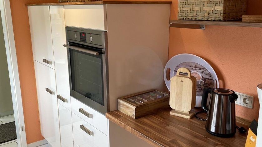 - Die moderne Küche enthält eine Spülmaschine, einen Induktionsherd, einen Backofen, einen Kühlschrank mit Gefrierfach, Sekt- und Weingläser, Geschirr, Toaster und Kaffeemaschine.