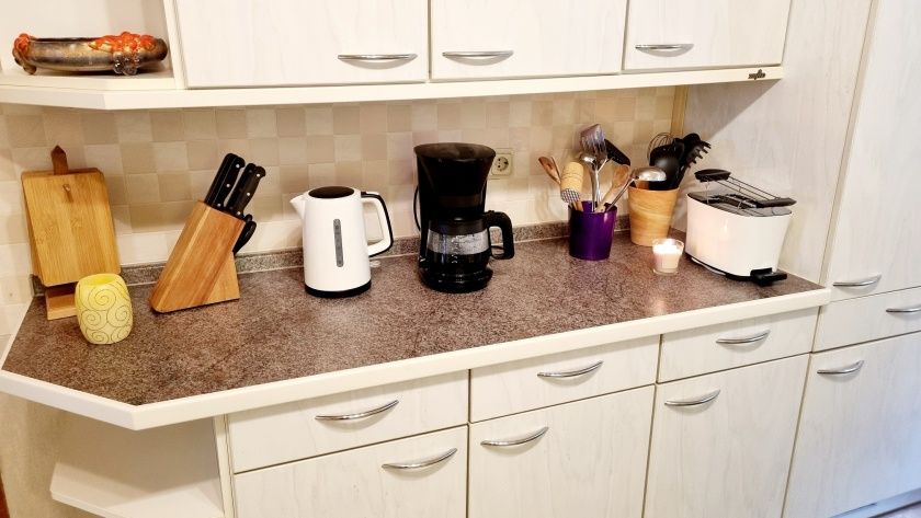 - Voll ausgestattete Küche mit Spülmaschine, Kühlschrank, Herd mit Ceranfeld, Backofen, Tisch und 4 Stühlen, Kaffeemaschine, Toaster, Wasserkocher etc. Ausstattung