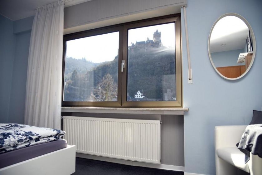 Für einzelreisende Gäste oder als Ergänzung können wir Ihnen auch ein komplett ausgestattetes Einzelzimmer mit schönem Blick auf Mosel und Burg anbieten. Waschgelegenheit haben Sie im Zimmer, Dusche und WC finden Sie über den Flur zu Ihrer alleinigen Nutzung!