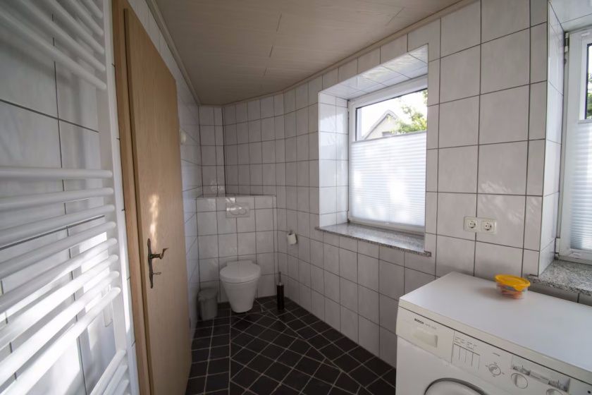 - Badezimmer mit begehbarer Dusche, Toilette, Waschbecken, Handtuchheizkörper und Waschmaschine