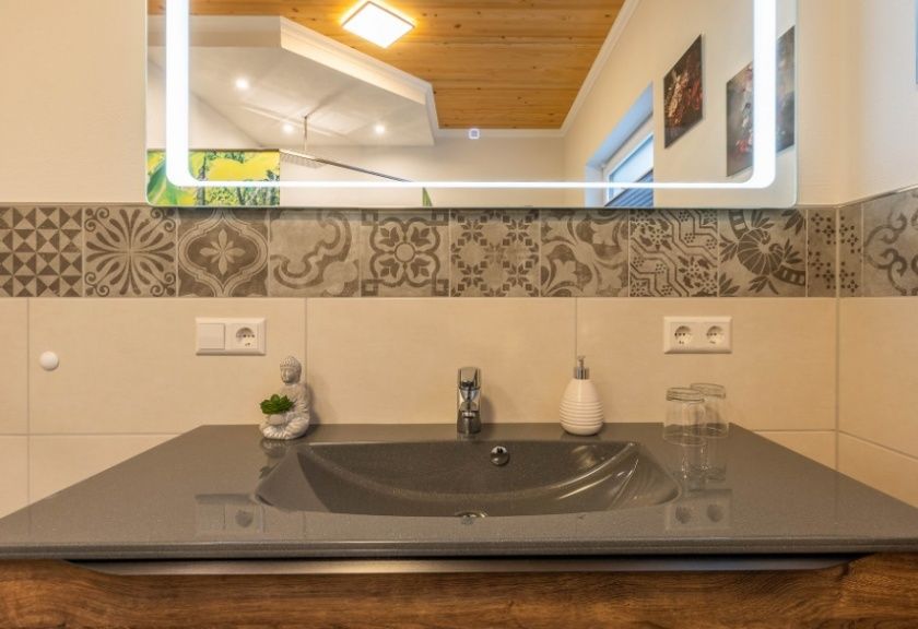 Nach einem Saunagang ist eine entspannende Dusche das Tüpfelchen auf dem i. Unser klassisch-modernes Bad ist nicht nur ein absoluter Hingucker, sondern bietet Ihnen auch eine riesengroße Raindance-Dusche, in der Sie sich – nicht nur alleine – dem erfrischenden Nass hingeben können. Fühlen Sie sich als ständen Sie inmitten eines Regenwaldes im warmen Sommerregen und spüren Sie das belebende Gefühl einer frischen Dusche in purem Luxus.