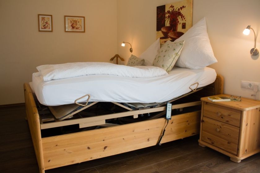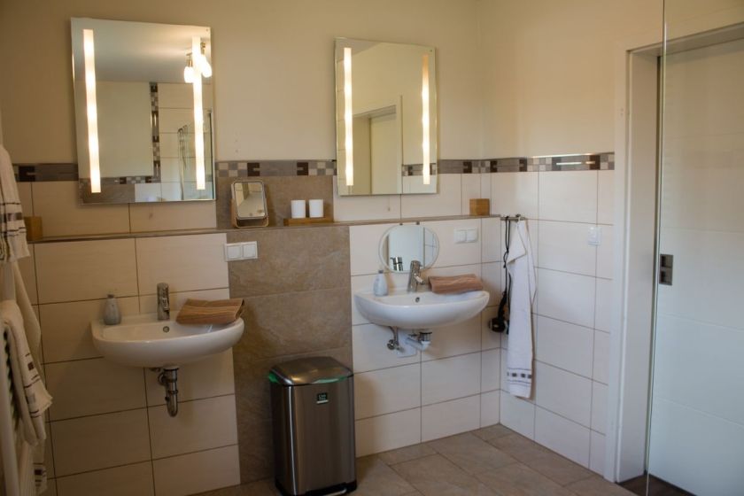 Es ist für Rollator und Rollstuhl geeignet. Im großen Bad befindet sich eine ebenerdige befahrbare Dusche. Es gibt zwei Waschgelegenheiten, eine davon ist unterfahrbar. Die Küche ist mit Rollator gut zu nutzen, für Rollstuhl weniger geeignet.