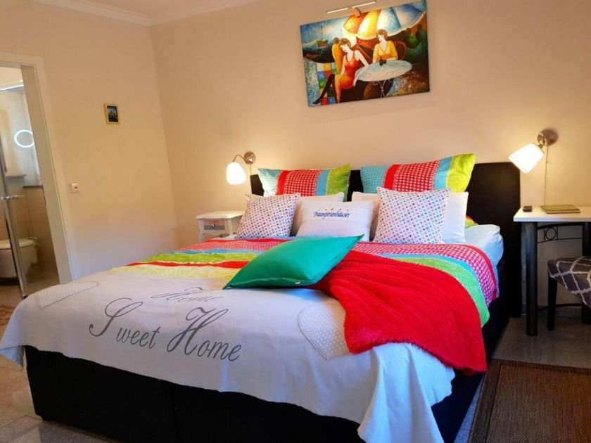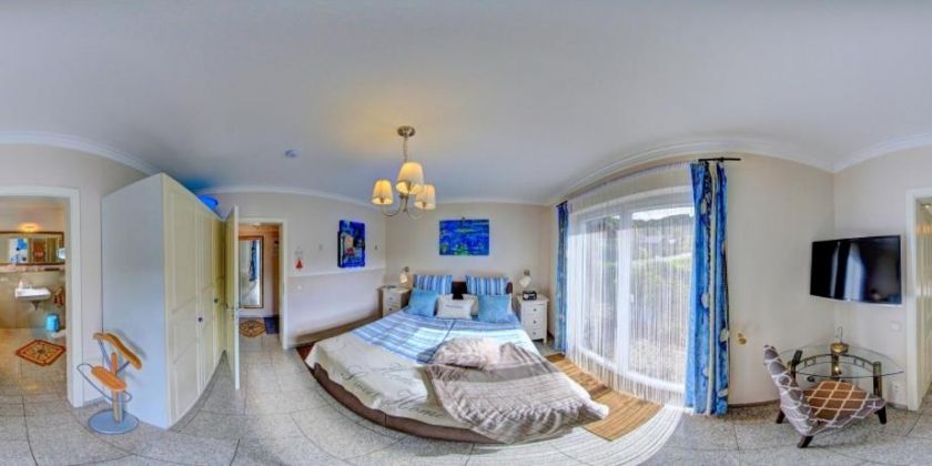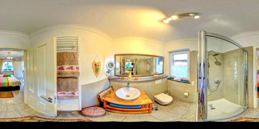 Das Obergeschoss ( 6 Pers.) hat 80 qm, 3 Schlafzimmer, mögliche Zustellbetten, bei Buchung des ganzen Hauses wäre der 2. Wohnbereich dieser Wohnung als separates Schlafzimmer nutzbar für bis zu vier Personen) + Küche, Flur u. Bad mit einer großen Dusche. Balkon mit Panoramablick über den See + eigene Terrasse mit Holzmöbeln und Grillkamin. Relaxen Sie und genießen Sie den Traumblick auf dem Badesee.