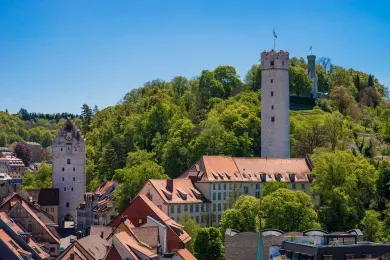 - Von der Burg aus haben Sie einen tollen Blick auf die Dächer von Ravensburg, die umliegenden Landschaften und bei gutem Wetter sogar bis zu den Alpen.