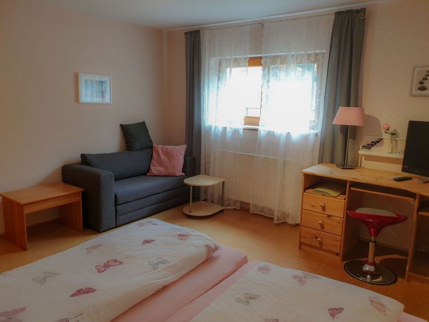 Der südseitige Wohn- und Schlafraum ist ansprechend eingerichtet und mit einem TV - Mediareceiver ausgestattet. Ein 1,80 x 2,00 Meter großes Bett, sowie eine Schlafcouch stehen für Sie bereit. Bei Bedarf ist ein Babybett verfügbar.