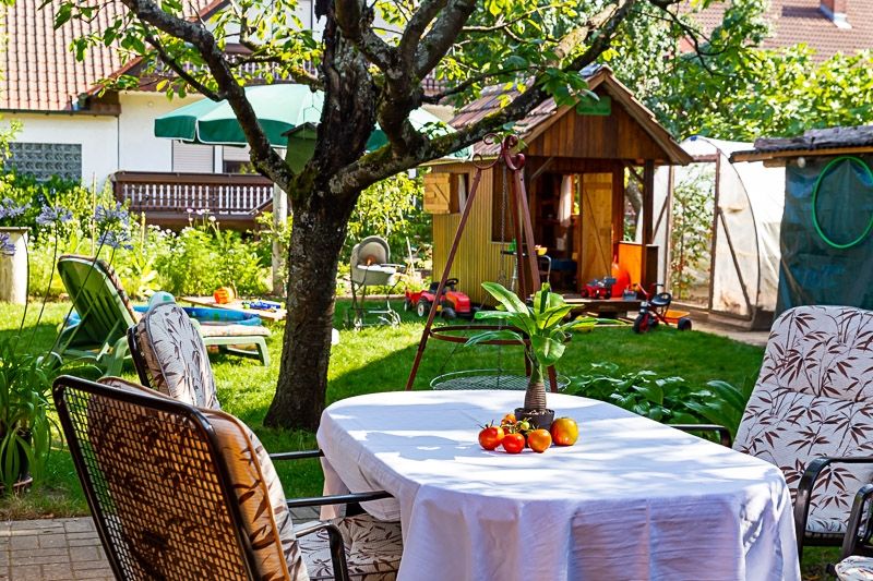 • Unser großzügiger Garten mit Rasenfläche lädt zum Spielen und Grillen ein, während im Gartenhäuschen eine Vielzahl von Spielgeräten und Fahrzeugen auf kleine Entdecker warten