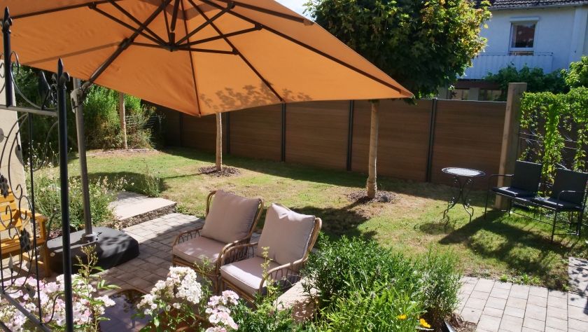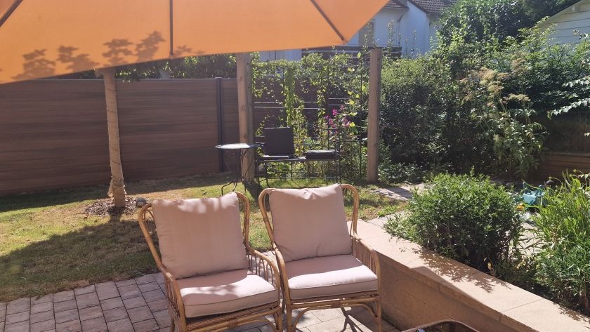 - Terrasse mit Sitzbank und zwei Sesseln, Sonnenschirm
