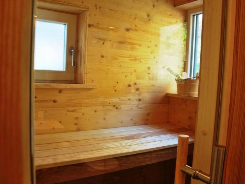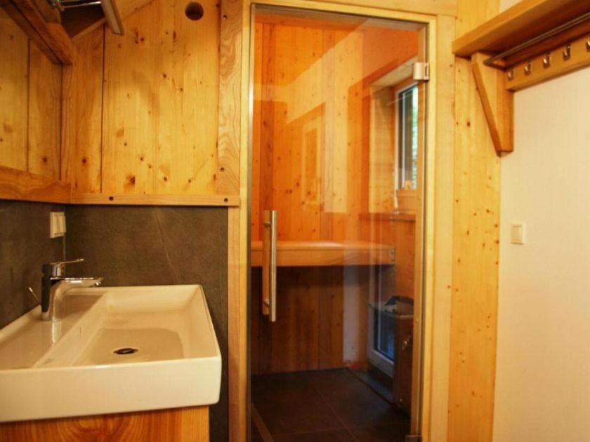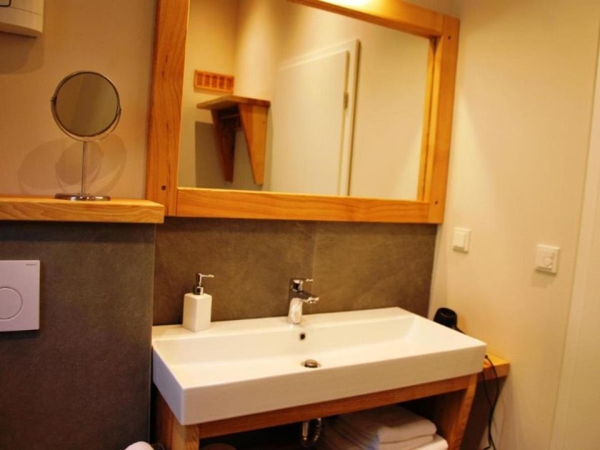 • Das moderne Bad bietet Dir eine Walk-In Dusche, edle Möbel aus massivem Eschenholz und eine eigene Sauna mit großem Fenster zum Naturschutzgebiet.