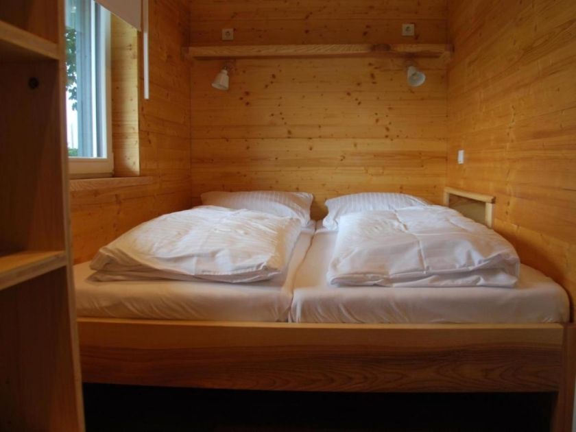 • Das Schlafzimmer mit seiner urgemütlichen, 180 cm breiten Schlafkoje hat Wände aus Naturholz. Hier kannst Du schon mit offenen Augen träumen.