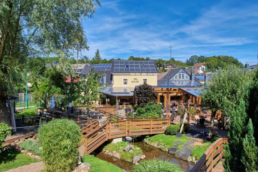 Das Wellnesshotel „Am Eifelsteig“ bietet gemütliche Einzel-, Doppel- und Familienzimmer sowie Ferienwohnungen. Gäste können im Café-Restaurant „Mausefalle“ mit Spielplatz entspannen und den Wellnessbereich mit Salzgrotte, Salionarium und Massagen im angrenzenden Gebäude genießen.