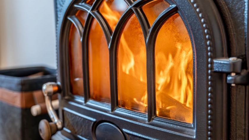 • Aus dem gemütlichen Wohnzimmer heraus hat man einen herrlichen Blick auf den Ahornbaum im Innenhof und den dahinterliegenden „Rapunzelturm“. Auf dem Ledersofa und den beiden Ledersesseln lassen sich gepflegt ein gutes Glas Rotwein oder ein alter Scotch trinken, erst recht, wenn im norwegischen Kaminofen mit großem Sichtfenster das Feuer prasselt. Hier stehen auch der Fernseher sowie ein Bluetooth-Radio im Retro-Look.