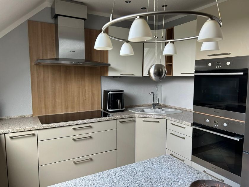 Die vorhandene Einbauküche ist voll und modern ausgestattet mit Geschirrspüler, Kaffeevollautomat, Dolce Gusto Pad-Maschine, Heißluftfriteuse, Mikrowelle, 2 Backöfen, 90 cm breitem Cerankochfeld, Wasser- und Eierkocher, Entsafter, Toaster, Sandwichmaker, Waffeleisen, Kontaktgrill und einer großen Kühl-/Gefrierkombination. Geschirr, Töpfe, Gläser und Besteck sind in ausreichender Menge vorhanden. Geschirrspültabs und Putzmittel sind inklusive.