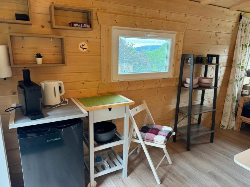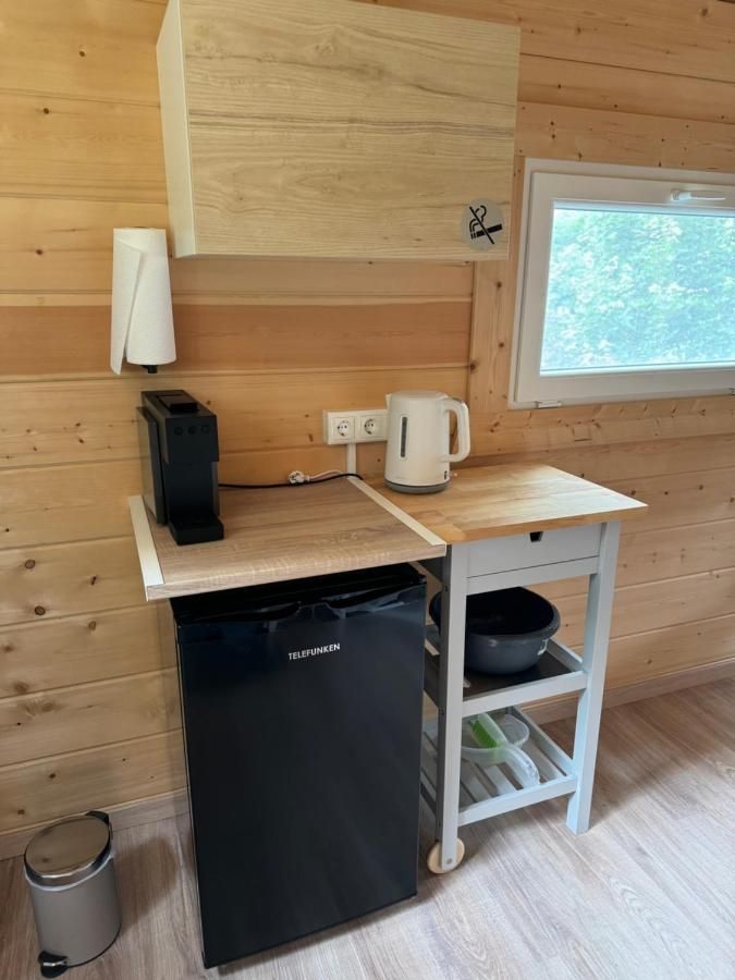 - Geschirr, Kaffeemaschine mit Kaffeekapseln, Wasserkocher, Kühlschrank