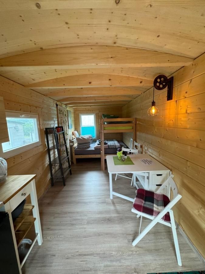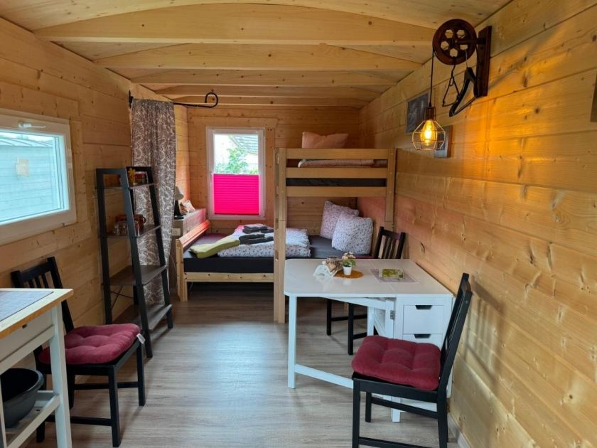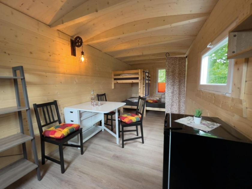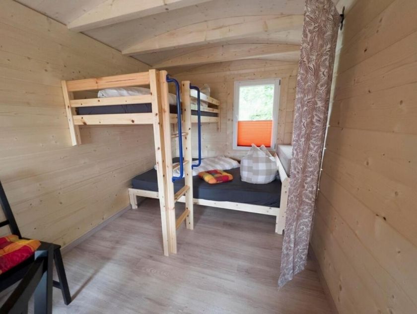 Die 3-Bett-Karren für 2 oder 3 Personen mit den Namen „Schäferkarren“, „Einhornhütte“, „Dumbo-Wagen“, „Bloxberg“, „Burgblick“ und „Köhlerwagen“ verfügen über ein Doppelbett, ein Etagenbett und auf Wunsch auch über ein Kinderbeistellbett.