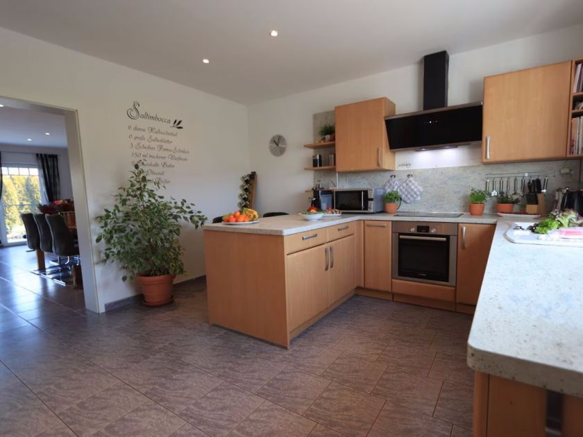 • … in die große, modern eingerichtete Küche mit Induktionskochfeld, Ofen, Spülmaschine und weiteren technischen Helferlein.