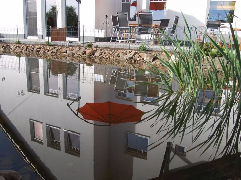 • Terrasse am Haus und Teich: Wenn Sie auf unserer großen Terrasse stehen, haben Sie einen wunderbaren Ausblick über den ca. 50 qm großen (übrigens mückenfreien) Teich auf die gegenüberliegende grüne Hügelkette.