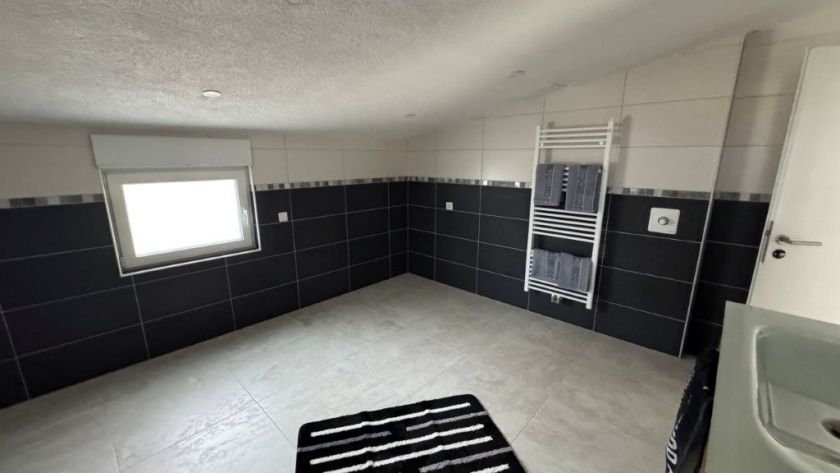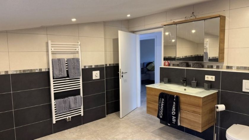 • Badezimmer: Modern ausgestattetes Bad mit Waschmaschine, Trockner, Dusche und WC.