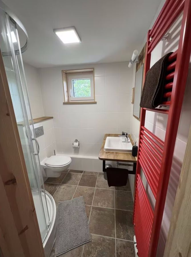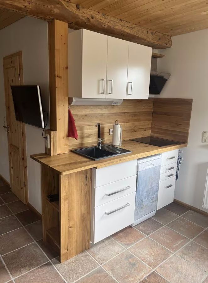Bei der Ferienwohnung handelt es sich um eine kleine, liebevoll eingerichtete Ferienwohnung mit 2 Zimmern und 2 Bädern. Ein Studio mit Küchenzeile, Schlafcouch und separatem Badezimmer. Eine großzügige Diele sowie ein kleines Schlafzimmer mit offenem Wäscheschrank und ebenfalls einem separaten Badezimmer.