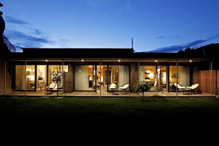 Das begrünte Flachdach wirkt klimatisierend, so dass wir bislang auf eine aufwendige Klimatechnik verzichten konnten. Beheizt wird die Ferienanlage durch eine Luft-Wärmepumpe. Die gewählte Baukonstruktion schirmt das Gebäude gegen gesundheitsschädliche Strahlungen wie Radon und elektromagnetische Wellen ab.