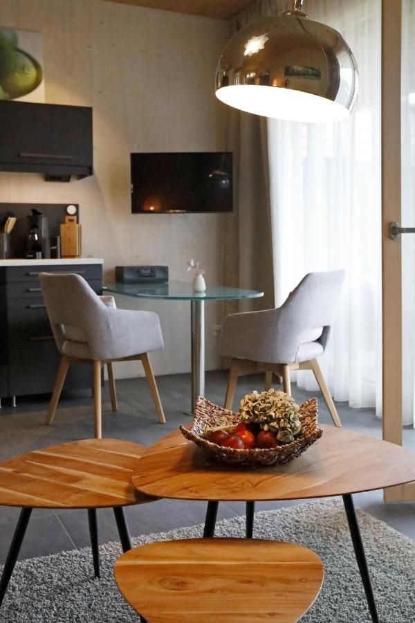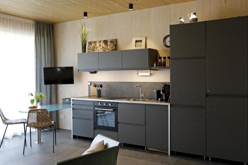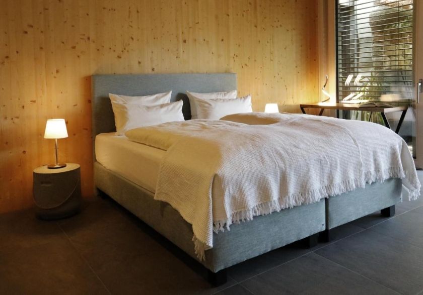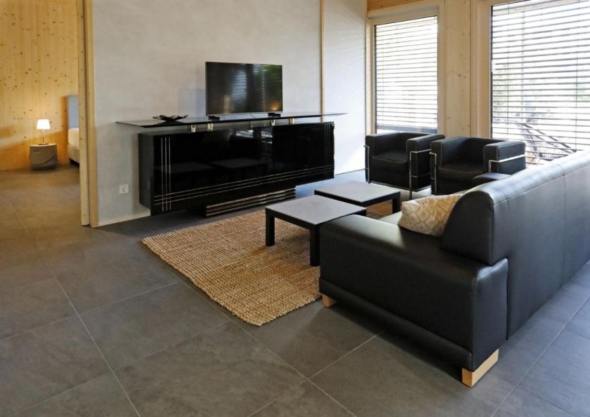 Der angegliederte Neubau mit den Ferienappartements ist in biologischer Massivholz-Bauweise erstellt. Zu jedem Appartement gehört eine großzügige, überdachte Terrasse als Loggia.