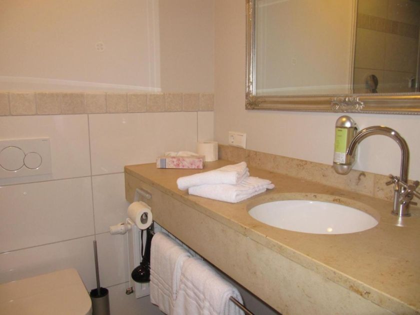 - Bäderausstattung: Fliesenboden, Dusche, Toilettenpapier, Handtücher, Duschtücher, Pflegeprodukte, Haartrockner
