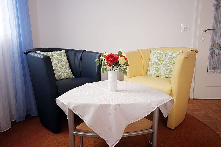 - Zimmer 1: Überhohes Bett für barrierearmen Ein- und Ausstieg. Gemütliche Leseecke als Rückzugsmöglichkeit.