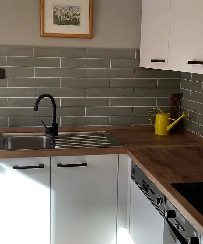 - Küche: Herd Ceranfeld, Backofen, Geschirrspüler, Mikrowelle, Kühlschrank mit Gefrierfach, Kaffeemaschine, Toaster, Eierkocher, Wasserkocher, Vitamix – perfekt für Smoothies, Fußboden: Laminat.