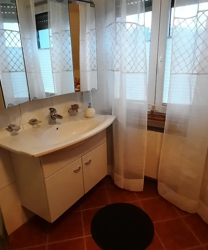 - Badezimmer: 1 Vollbad im 1 OG mit Regendusche und Badewanne, Fön, 1 Gäste WC im EG, Fußboden: Fliesen.