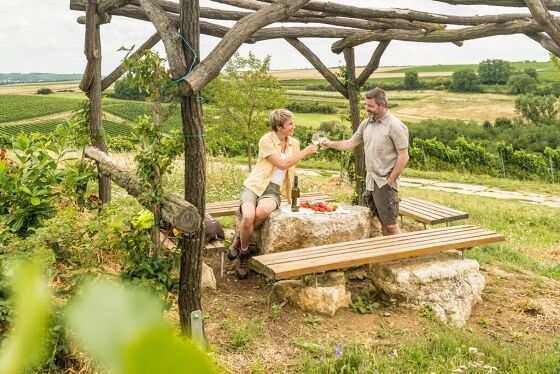 Von da aus geht´s in die Weinberge. Dort können Sie Ihren Blick über Nieder-Olm und Saulheim schweifen lassen. Meldet sich der kleine Hunger, können Sie Ihre Brotzeit in der Schutzhütte „Wingertshaus Schindegaul“ oder am 5 m „Langen Tisch des Weines“ genießen, der extra für größere Gruppen eingerichtet wurde. Geologie-Interessierte werden das erste Terroir-Bodenprofil bemerken. Die Infotafel klärt Sie über die relevanten Faktoren Klima und Boden (hier Kalksandstein) auf. Höchst interessant!